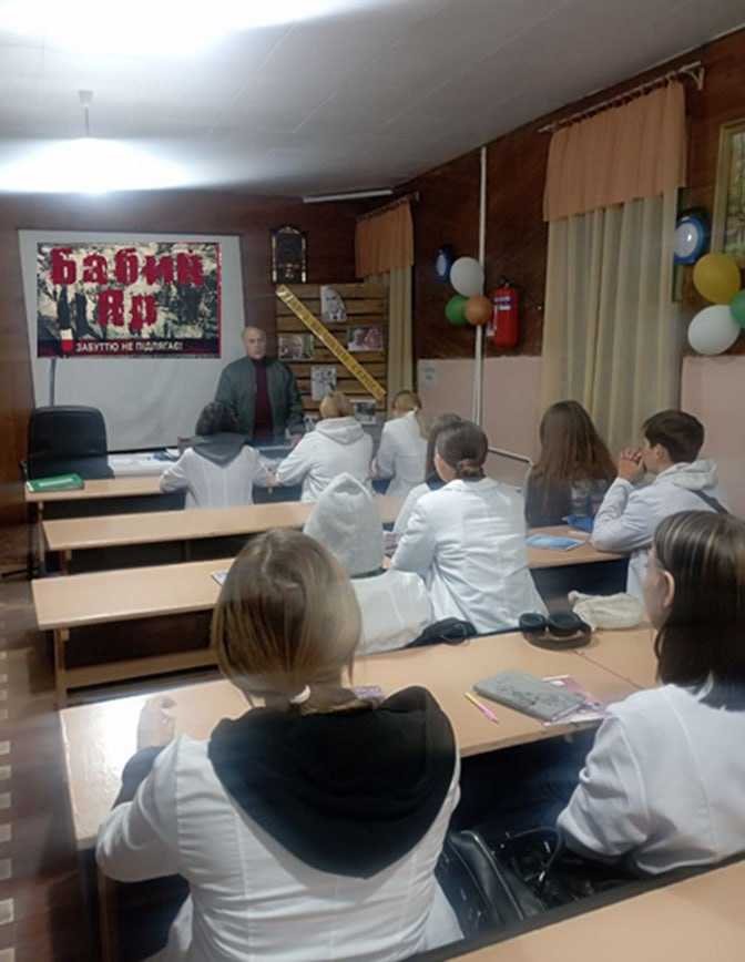 У 84-ті роковини цих подій студенти першого курсу зібралися на урок історичної пам’яті «Бабин Яр: пам’ять на тлі історії». Викладач історії Віктор Олійник розповів про ті страшні дні, наголосивши, що пам’ять про минулі трагедії допомагає нам розпізнавати зло сьогодні й робити все, щоб воно ніколи не перемогло. Бо колективна пам’ять – це наша сила. Вона об’єднує нас у боротьбі за свободу, гідність і людяність сьогодні.