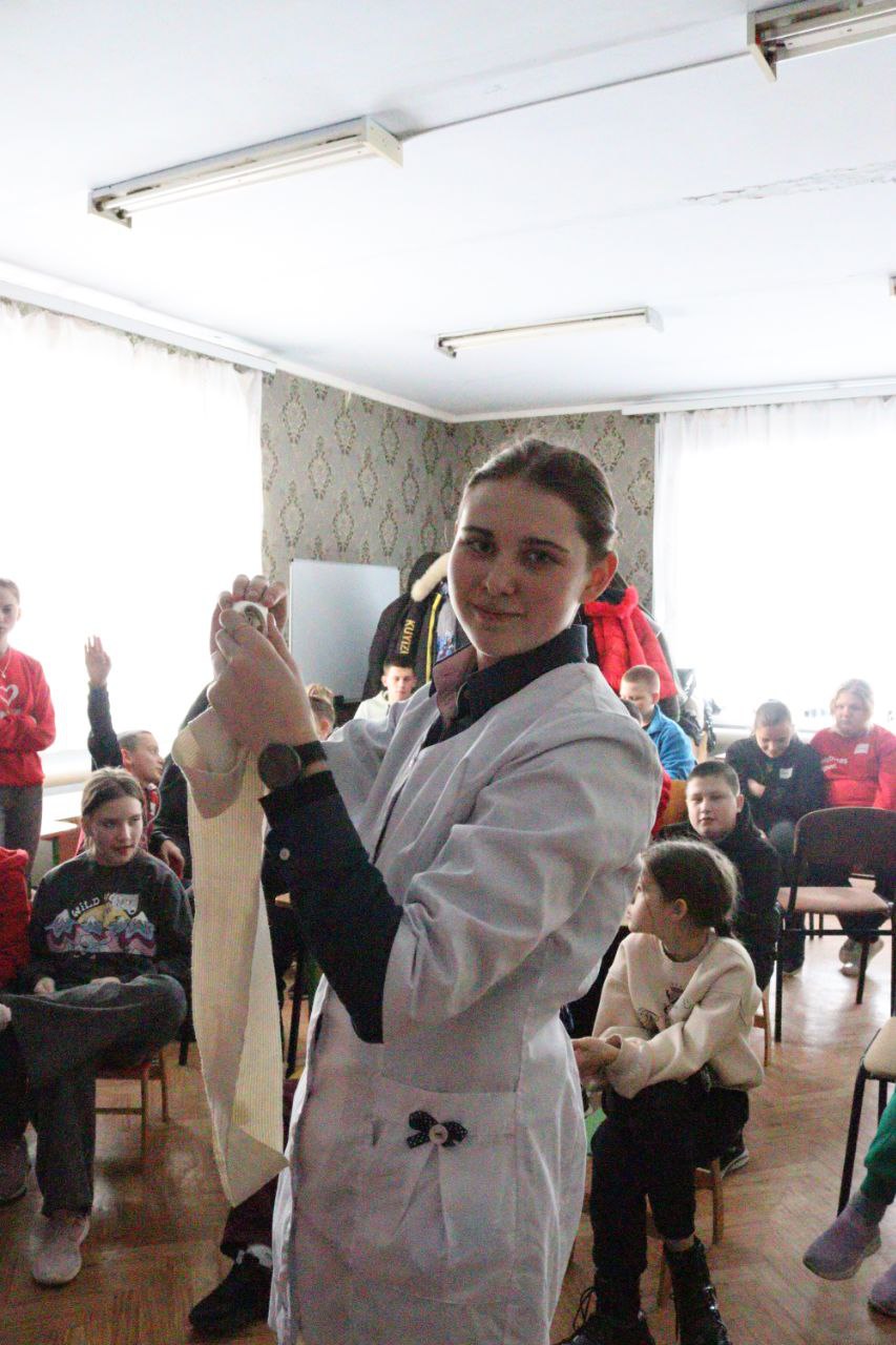 Байтрак Юлія та Полякова Ірина провели для учнів майстер-клас щодо надання першої допомоги при серцевому нападі, ознайомили учнів з накладанням різних хірургічних пов’язок, що є досить актуальними в наш час. Всі бажаючі учні практикувалися у накладанні хірургічних пов’язок та проводили серцево-легеневу реанімацію. Вказані навички виявилися цікавими та корисними для присутніх.