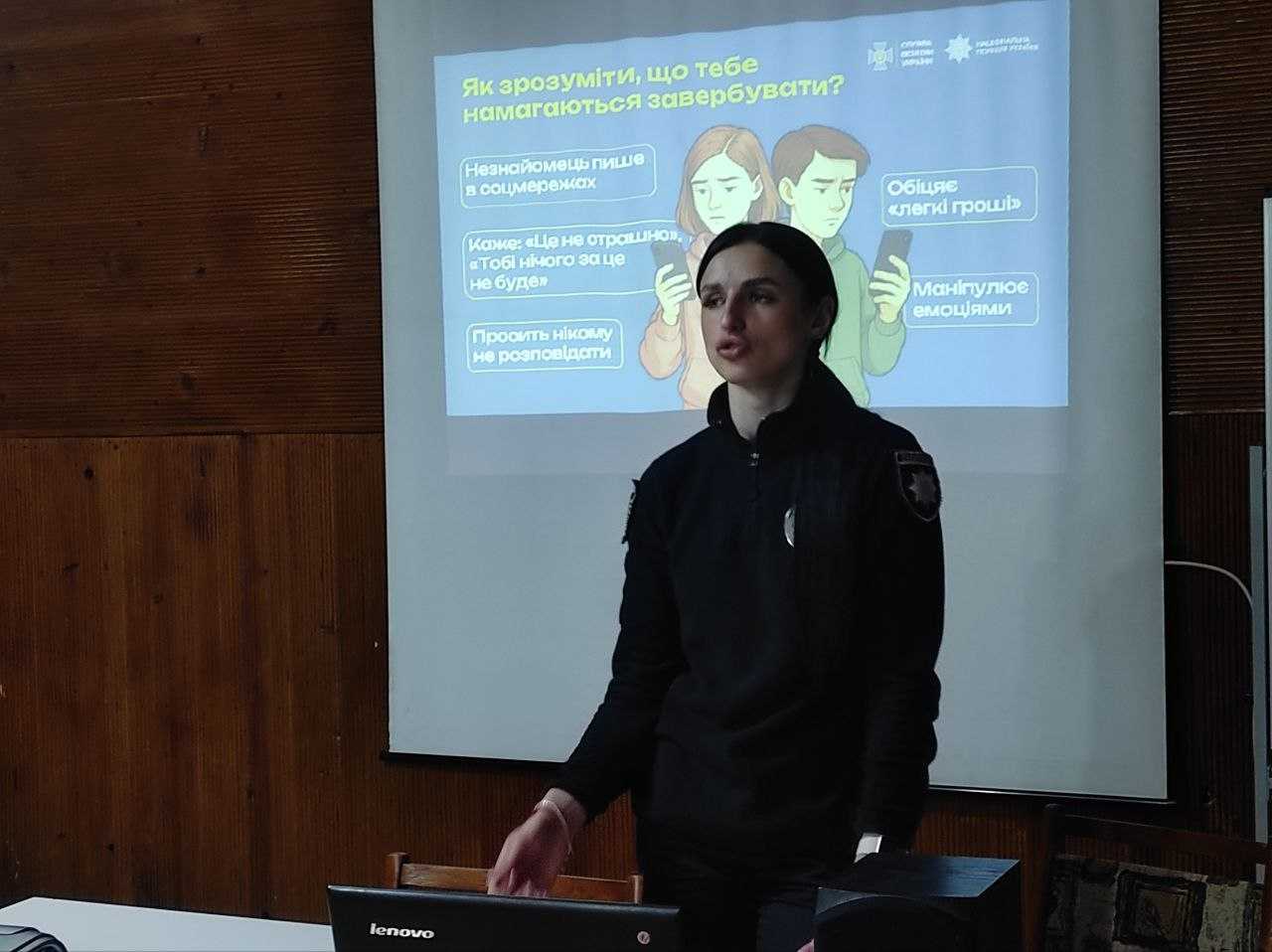 Поліцейська розповіла підліткам, як розпізнати спроби вербування, що робити у випадку отримання підозрілих пропозицій і куди звертатися за допомогою. Особливу увагу приділили темі психологічного впливу: маніпуляції чи тиск – типові прийоми, якими користується ворог для контролю свідомості молоді.