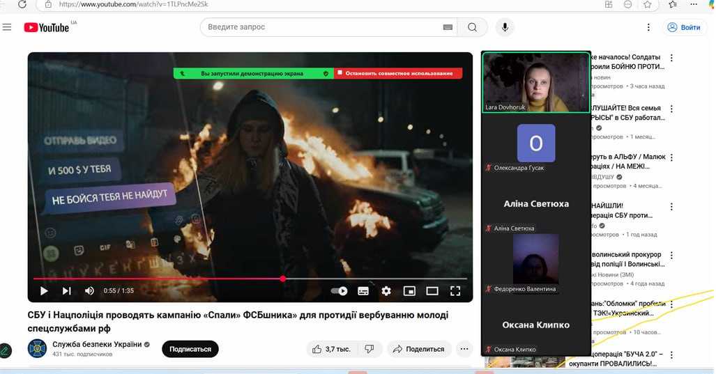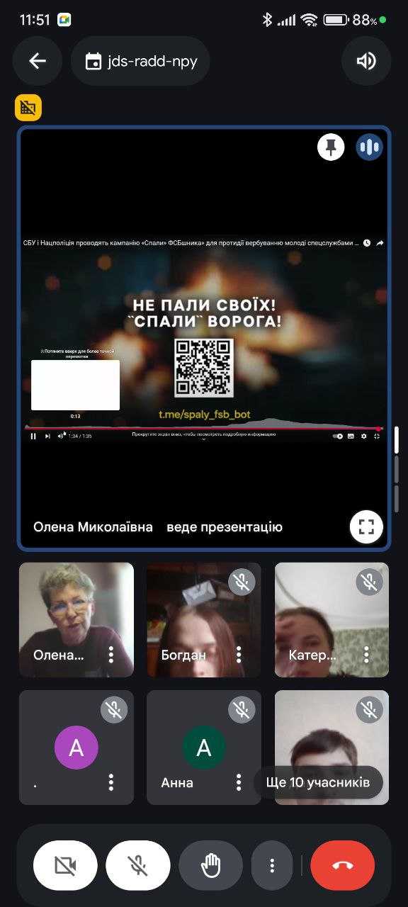 Звернули увагу здобувачів освіти на те, що про будь-які спроби вербування необхідно повідомити у спеціальний чат-бот «Спали ФСБшника». Особливо наголошувалось на відповідальності, що настає за вчинення такого виду правопорушень.