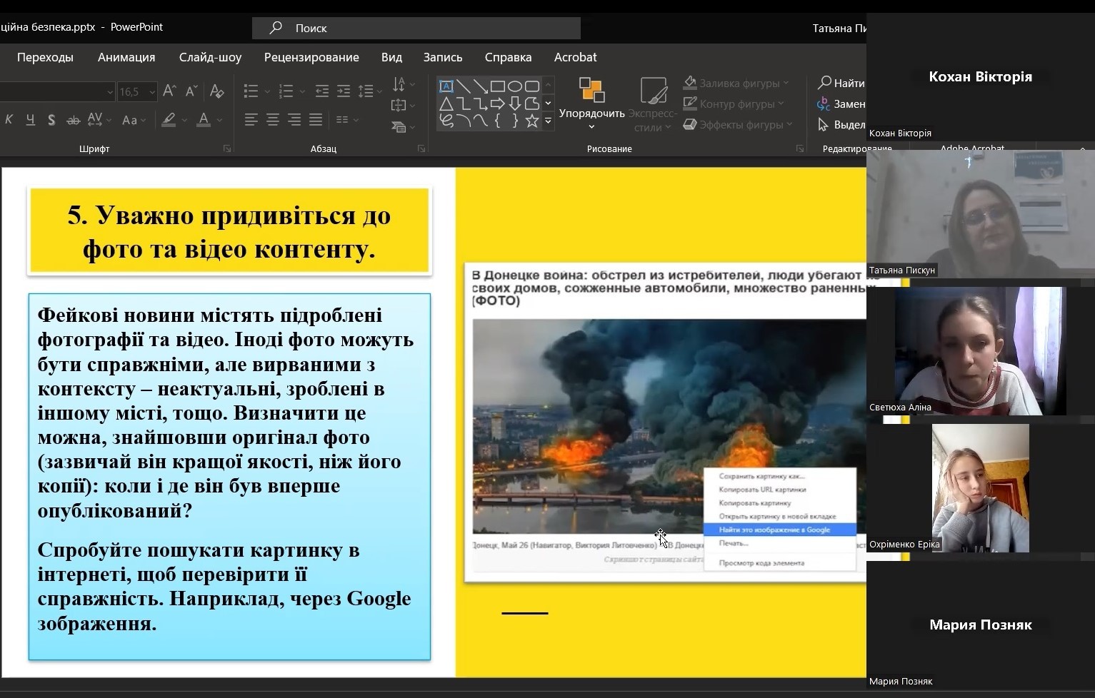 Практичне заняття спрямоване на розвиток уміння ідентифікувати фейки та протистояти їхнім негативним впливам. Головна мета заняття – розвиток критичного мислення щодо інформації, набуття практичних навичок для її ефективного пошуку та аналізу, інформаційна та візуальна грамотність.